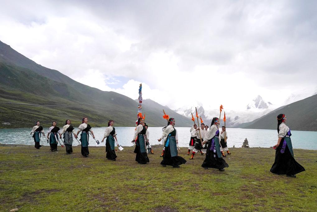 西藏那曲市比如县艺术团的演员在萨普雪山景区为游客表演(7月19日摄)。新华社记者 晋美多吉 摄